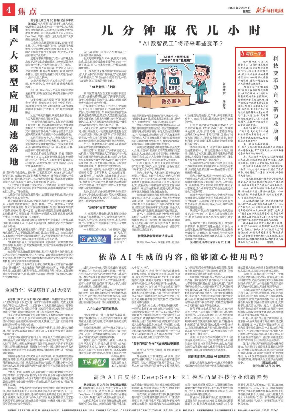 深圳福田区70名“AI数智员工”上岗的消息近日引发热议。公文处理效率提升90%、执法文书秒级生成、民生诉求分拨准确率提升至95%……这不仅是技术的突破,更是一场政务生产关系的系统性变革。AI与众多行业“联姻结对”推动了各领域智能化转型:在医疗领域,AI通过分析患者的病历和基因数据,能够预测潜在疾病风险,为个性化治疗提供支持;在制造业,AI结合大数据和云计算,为汽车、电子等行业打造智能化质检解决方案;AI还与信息、教育、金融、交通等领域深度融合,人们日益感受到AI在提升行业效率方面带来的新变化。本次70名“AI数智员工”的上岗,更引发了人们对职业前景的重新思考。对于人类的职业生涯来说,AI真的是洪水猛兽吗?第一次工业革命机械化,蒸汽火车的发明让司机这个新兴职业开始蓬勃发展。有了蒸汽火车,人们不再眷恋乘坐马车出行的时代。第二次工业革命电气化,煤油灯制造工失业,但是能源和交通革命催生了现代工业体系,创造了大量蓝领和白领岗位。第三次工业革命信息化,传统的印刷工丢了工作,信息化和自动化提升了生产效率,同时创造了计算机、互联网、半导体等大量岗位。一次次颠覆性的科技革新,带来的是社会生产力的大解放和生活水平的大跃升,从根本上改变了人类历史的发展轨迹。如今,AI作为辅助工具正在蓬勃发展,目的是让人类从繁琐的重复性工作中解放出来,那些重复性强、流程化重的事,AI可能工作效率更高。与AI浪潮相适应的,更具创造性和复杂性的“人机协作”岗位正在加速产生,比如无人机飞手、AI训练师、数据分析师等。AI写出的模式化公文,如何强“筋骨”,需要“真人”创意;AI分拨民生诉求后,需要真人跟进、解决;AI分派任务,省下不同部门开会商讨的时间,具体的事还需要人来拍板……技术革命正在孕育全新的职业版图,AI通过“人机协同、数智驱动”的新型工作模式,实现从“替代人力”到“激活人力”的价值跃迁。科技变革的本质是“解放生产力”,是重塑竞争力的杠杆。与其担忧,不如破除恐惧,积极拥抱新技术,拥抱更具包容性和创造力的未来。